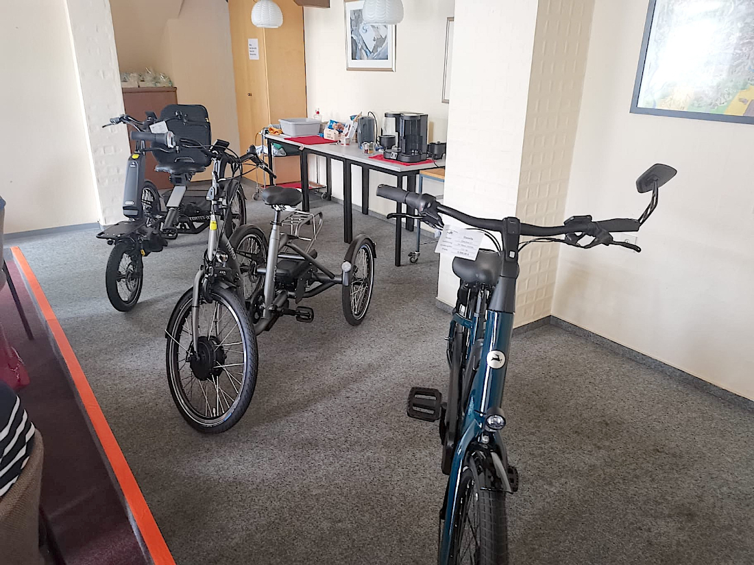 Nach dem Fahrtraining ging es wieder zurück ins Büro zu einer weiteren Erläuterung. Herr Papst hatte drei Fahrräder für Menschen mit Handicap ausgestellt, zu denen er umfangreiche Infos gab. Eine Probefahrt auf den Rädern war leider aufgrund des regnerischen Wetters nicht möglich. Herr Papst bot an, auf Wunsch die Probefahrten bei seinem Geschäft nachzuholen.
